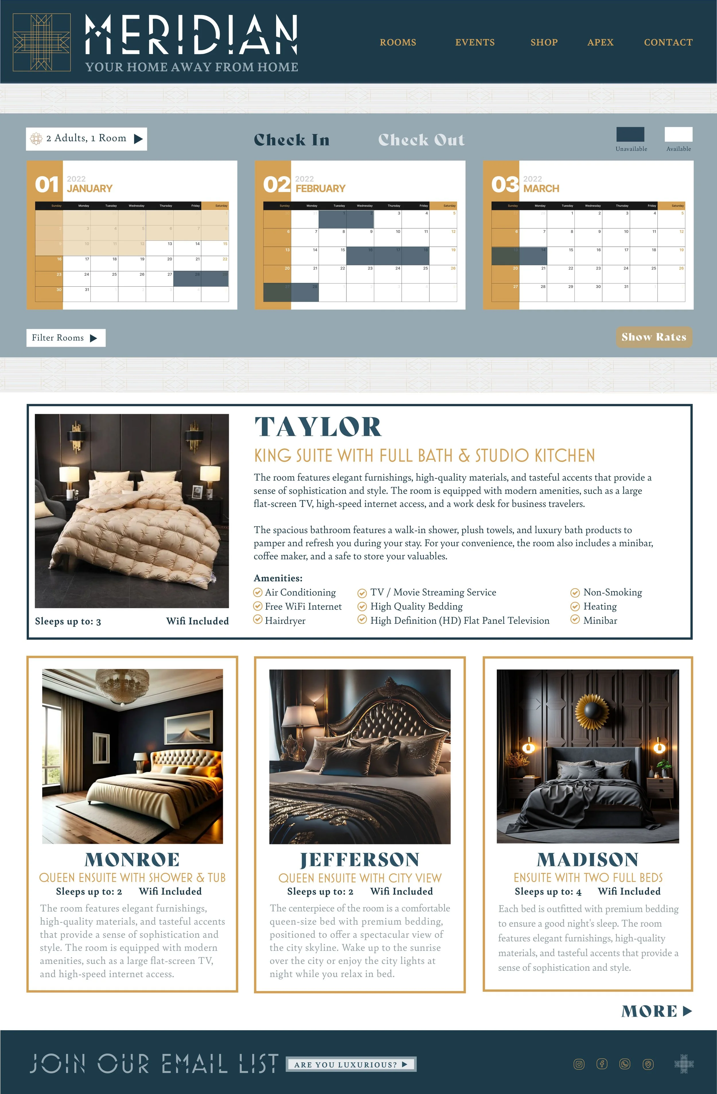 With this project, I found myself leading a complex undertaking—working fully inside out and upside down. I was tasked with creating and branding a boutique hotel, to be located in Nashville, TN. My responsibilities went beyond norms as I curated every aspect, from selecting the hotel's edifice (an actual available building in Nashville) to detailing its interior. Beyond the physical, I crafted a narrative of sophistication and charm. To ensure seamless integration, I created a style and branding guide—a manual outlining the interplay of branding, signage, and interior design. The Meridian emerged not just as a place of art deco luxury and repose but as a testament to the fusion of vision and execution.